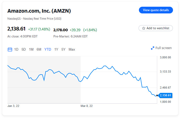 The tech giant reported a net loss of $3.8 billion in the first quarter, or $7.56 per share, compared Bloomberg to estimates of earnings per share of $8.40. In the same period last year, Amazon logged a net income of $8.1 billion, or $15.79 per share. Amazon attributed its net loss for the first quarter of 2022 to a pre-tax valuation loss of $7.6 billion from its investment in Rivian Automotive, Inc. (RIVN).