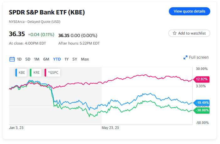 As of Thursday, the S&P Bank Index ETF (KBE) and the S&P Regional Bank Index ETF (KRE) were down more than 20% and 30% year to date, respectively. The S&P 500, in contrast, has gained nearly 11% this year.